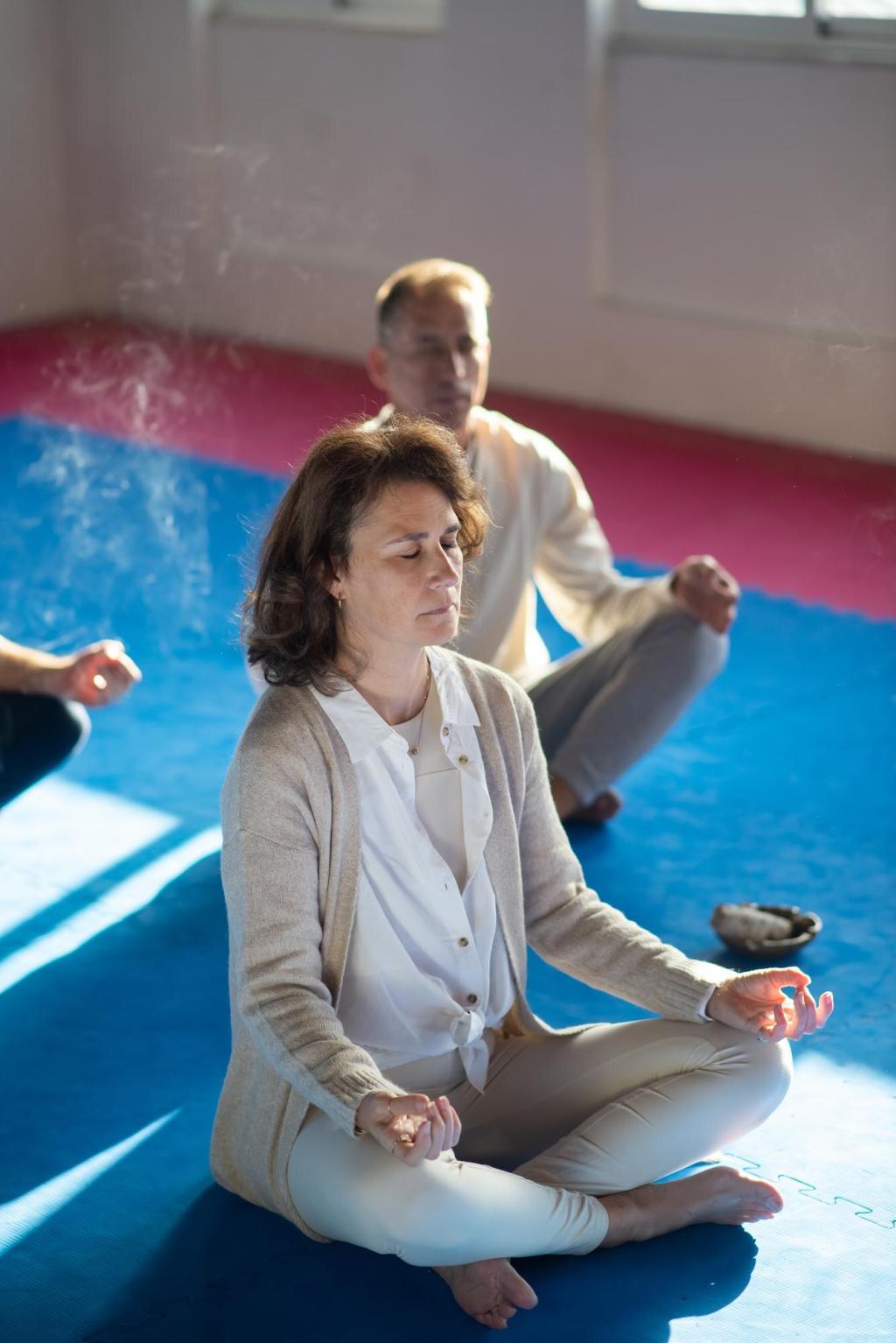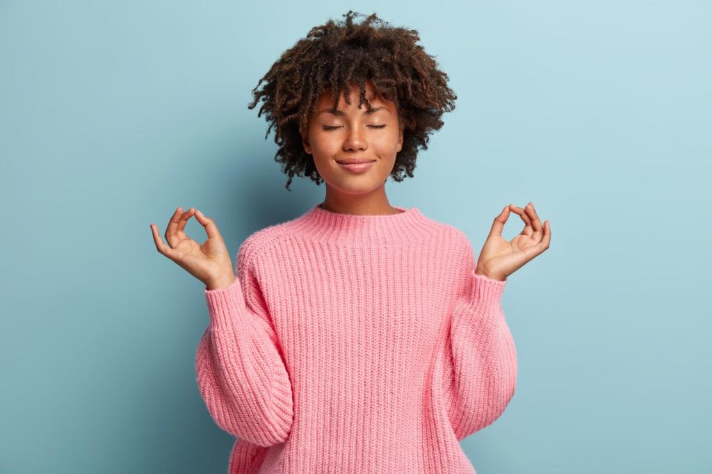 Uncross legs, plant feet, and lengthen spine. Inhale to broaden collarbones; exhale to soften ribs. Gently rotate neck, floss shoulders, and glide wrists. Two minutes restores attention and releases keyboard-tight forearms.